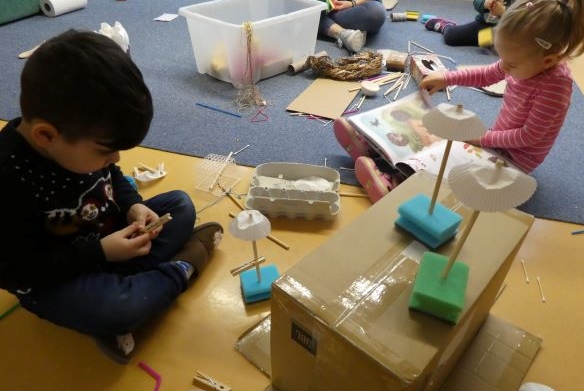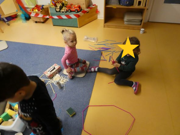 Dafür sollten die Kinder an diesem Tag eine Kiste voll neuen Materialien zum Spielen bekommen. Als die Kiste in die Mitte des Morgenkreises geholt wurde, musste alles erstmal sofort begutachtet werden. Die Kinder fanden: Holzwäscheklammern, Wolle, Schwämme, Papierstrohhalme, Decken, Eierkartons und noch viel mehr. Der Kreativität waren keine Grenzen gesetzt.
