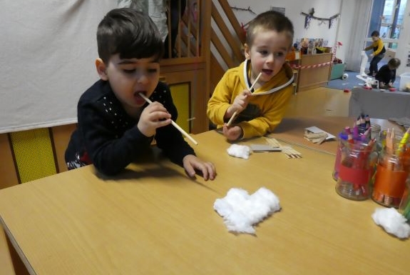 Sofort begannen einige Kinder aus den Decken und Wäscheklammer eine Höhle zu bauen. Die Wolle wurde in alle Richtungen abgerollt und ein Spinnennetz entstand. Die Schwämme wurden um die Wette gestapelt und Watte über den Tisch gepustet. Doch so schnell wie einiges an Chaos entstand, so schnell packten die Kinder auch mit an, alles wieder in der Kiste verschwinden zu lassen.