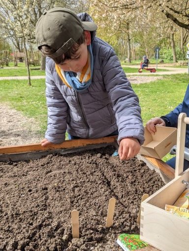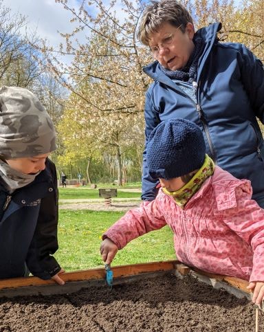 Im März und April sorgte das Projekt "Erde" für viel Begeisterung bei den Kindern. Der Höhepunkt war das Bauen von zwei Hochbeeten. Dies geschah mit Unterstützung von Familie Krentz, welche uns freundlicherweise die Holzrahmen zur Verfügung stellte. Gemeinsam mit den Kindern, Erzieherinnen und Hausmeistern wurden die Hochbeete gestrichen, mit Erde befüllt und anschließend die Saat ausgesät. Anschließend wurde fleißig gegossen und sehnsüchtig erwartet, wann die ersten Pflanzen sprießen.