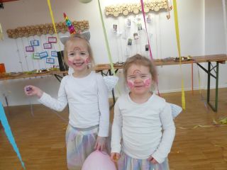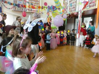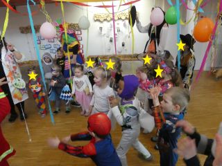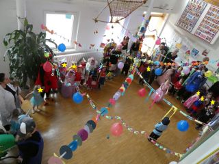 Am 20.02.2024 feierten wir unser jährliches Faschingsfest. Bei Tanz und verschiedensten Spielen, wie Dosenwerfen oder Glücksraddrehen, hatten die kleinen und großen Marienkäfer, Polizisten und Prinzessinnen viel Spaß. Auch im Sportraum zeigten die Kinder ihr Können beim Schneeballwerfen.