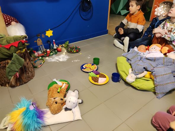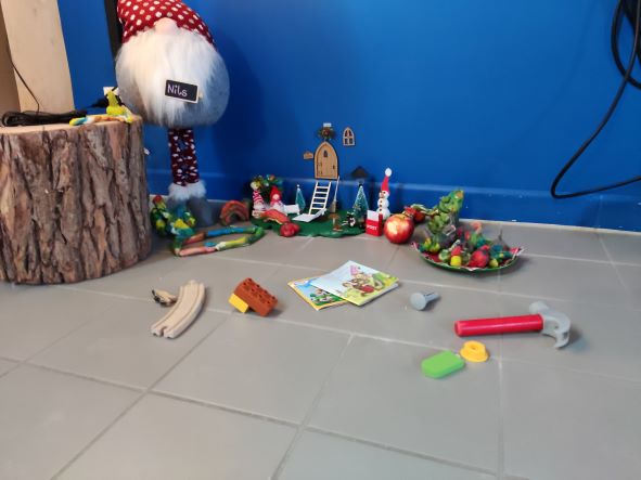 Was war denn da schon wieder los. Vor dem Wichtelhaus lagen Puppen und Kuscheltiere. Außerdem war da Puppengeschirr und Spielzeugessen.