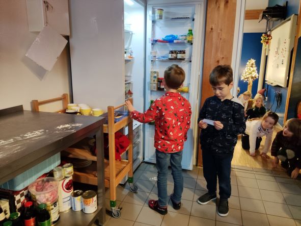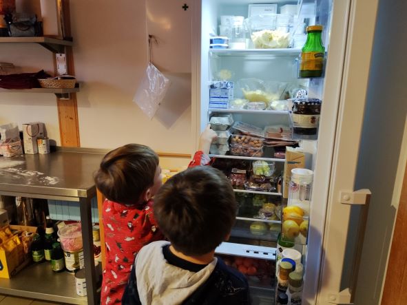 Heute lag vor Nils Häuschen eine Menge Mehl. Als wir seine Fußabdrücke zurückverfolgten fanden wir im Kühlschrank 2 riesige Schalen mit Keksteig. Den hatte Nils extra für uns übrig gelassen, damit wir Kekse backen können.